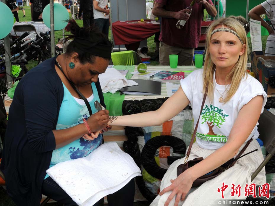 當?shù)貢r間2010年6月6日,英國倫敦舉行卡姆登綠色市集(Camden Green Fair),這是英國倫敦每年環(huán)保領域的“重頭戲”。本屆市集的主旨是要喚起大眾對環(huán)境問題的關注,選擇更加可持續(xù)發(fā)展的生活方式。據活動主辦方預計,本屆市集將吸引來自英國各地和世界各國的2萬多人參加。圖為本次活動的組織者Sinclair Eiloart(右)在體驗印度手繪藝術。Fiona/攝 Fiona 馬小剛/文