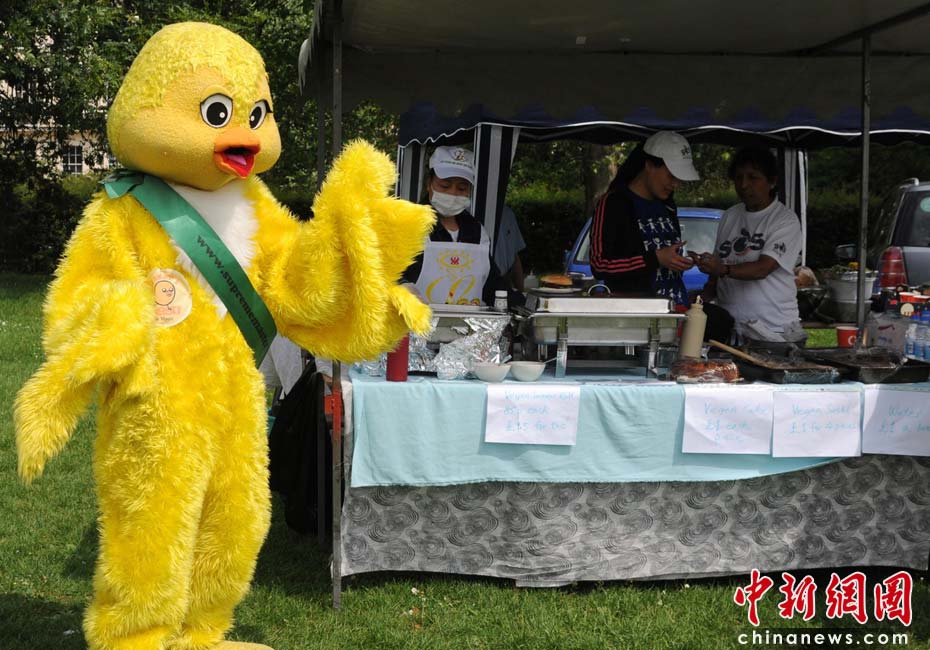 當?shù)貢r間2010年6月6日,英國倫敦舉行卡姆登綠色市集(Camden Green Fair),這是英國倫敦每年環(huán)保領域的“重頭戲”。本屆市集的主旨是要喚起大眾對環(huán)境問題的關注,選擇更加可持續(xù)發(fā)展的生活方式。據(jù)活動主辦方預計,本屆市集將吸引來自英國各地和世界各國的2萬多人參加。圖為打扮成小雞的素食主義者宣傳素食。Fiona/攝 Fiona 馬小剛/文
