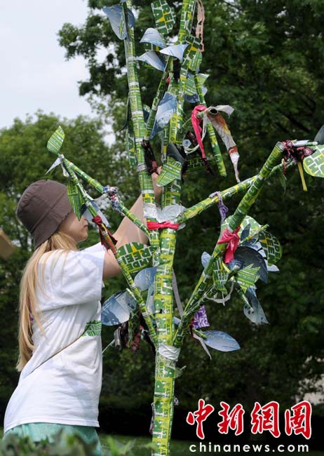 當(dāng)?shù)貢r(shí)間2010年6月6日,英國(guó)倫敦舉行卡姆登綠色市集(Camden Green Fair),這是英國(guó)倫敦每年環(huán)保領(lǐng)域的“重頭戲”。本屆市集的主旨是要喚起大眾對(duì)環(huán)境問(wèn)題的關(guān)注,選擇更加可持續(xù)發(fā)展的生活方式。據(jù)活動(dòng)主辦方預(yù)計(jì),本屆市集將吸引來(lái)自英國(guó)各地和世界各國(guó)的2萬(wàn)多人參加。圖為用回收的廢舊紙張制作的“小樹(shù)”。該樹(shù)由年輕的倫敦園藝設(shè)計(jì)師Sarah Veniard設(shè)計(jì)。她的設(shè)計(jì)理念是“美麗的可持續(xù)空間”。她認(rèn)為只要有充足的陽(yáng)光,陽(yáng)臺(tái)也可以變成一個(gè)集水果蔬菜和觀(guān)賞植物于一身的多功能花園。Sarah是純素食主義者,她結(jié)合顧客要求設(shè)計(jì)的瓜果園非常受歡迎。Fiona/攝 Fiona 馬小剛/文