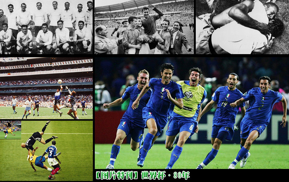 1930年,首屆世界杯在烏拉圭拉開帷幕,至2010年南非世界杯已走過80年歷史。在已經(jīng)結(jié)束的18屆世界杯里,有烏拉圭、意大利、德國(guó)、巴西、英格蘭、阿根廷和法國(guó)七個(gè)國(guó)家舉起冠軍獎(jiǎng)杯。在世界杯的歷史長(zhǎng)河中,有奪冠喜悅,也有飲恨失落,還有那些讓人難以忘記的鏡頭……