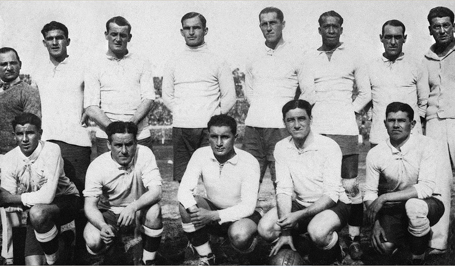 圖為首屆冠軍隊(duì)烏拉圭。第一屆世界杯參賽隊(duì)只有13支,包括4支歐洲球隊(duì)、8支南美洲球隊(duì)以及一支來自美國的代表隊(duì),不過這屆賽事體現(xiàn)了當(dāng)時世界足壇的最高水平。東道主烏拉圭隊(duì)4比2戰(zhàn)勝阿根廷奪得首屆冠軍,首都蒙得維的亞慶祝球隊(duì)奪冠的活動持續(xù)了幾天幾夜。為了紀(jì)念這場勝利,決賽后的第二天(7月31日)被定為全國性節(jié)日。
