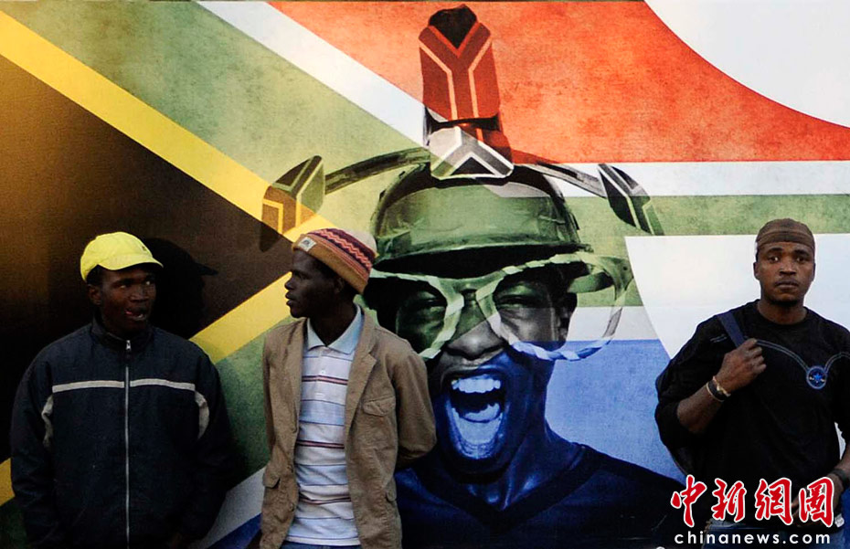 當(dāng)?shù)貢r間6月9日,民眾在南非約翰內(nèi)斯堡街頭的世界杯宣傳畫前,非洲大陸即將首次迎來足球世界杯。中新社發(fā) 廖攀 攝