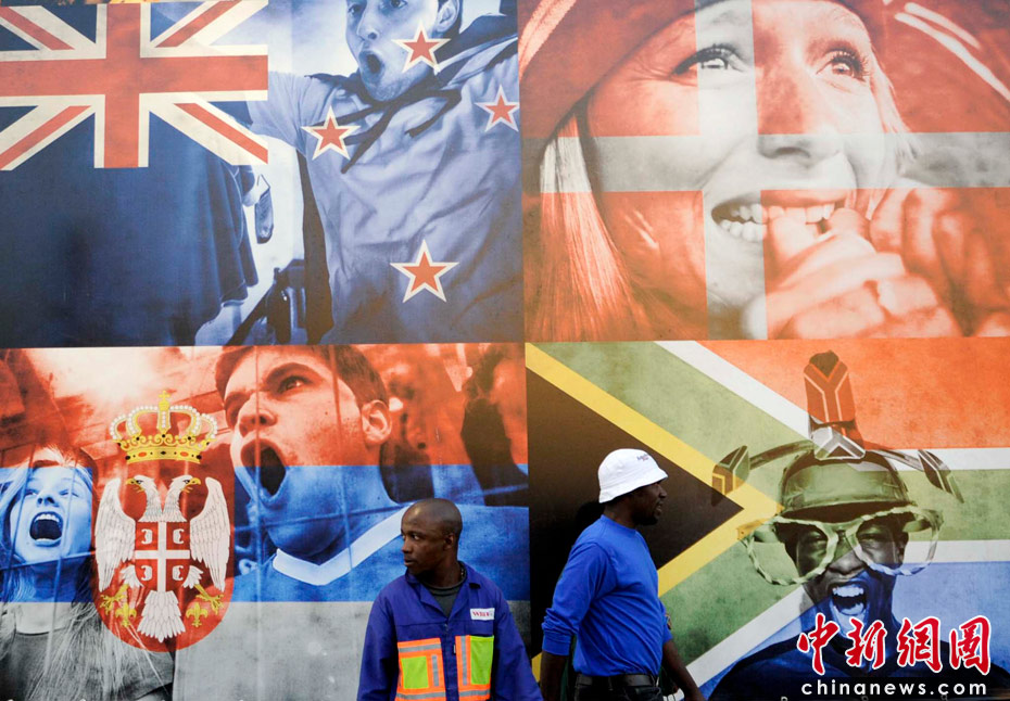 當(dāng)?shù)貢r間6月9日,民眾在南非約翰內(nèi)斯堡街頭的世界杯宣傳畫前,非洲大陸即將首次迎來足球世界杯。中新社發(fā) 廖攀 攝