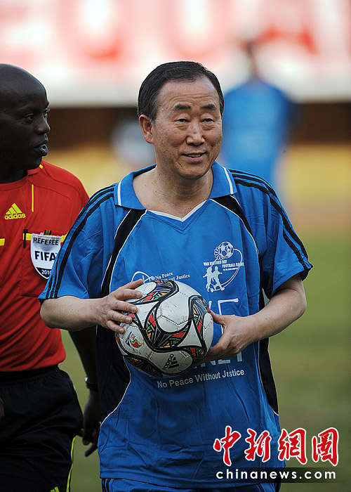 圖為2010年5月30日,聯(lián)合國(guó)秘書長(zhǎng)潘基文在曼德拉國(guó)家體育場(chǎng)參加足球賽。
