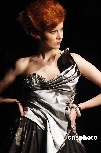 11月11日,北京中國國際時裝周2009春夏系列發(fā)布會推出董懷光高級時裝,創(chuàng)意來源于百年奧運,以奧運主體建筑結構的完美與大氣,將宏大的盛況和千年文化底蘊及建筑優(yōu)美的幾何立體元素融入到設計構思中。圖為模特展示董懷光高級時裝發(fā)布會作品。中新社發(fā) 錢興強 攝
