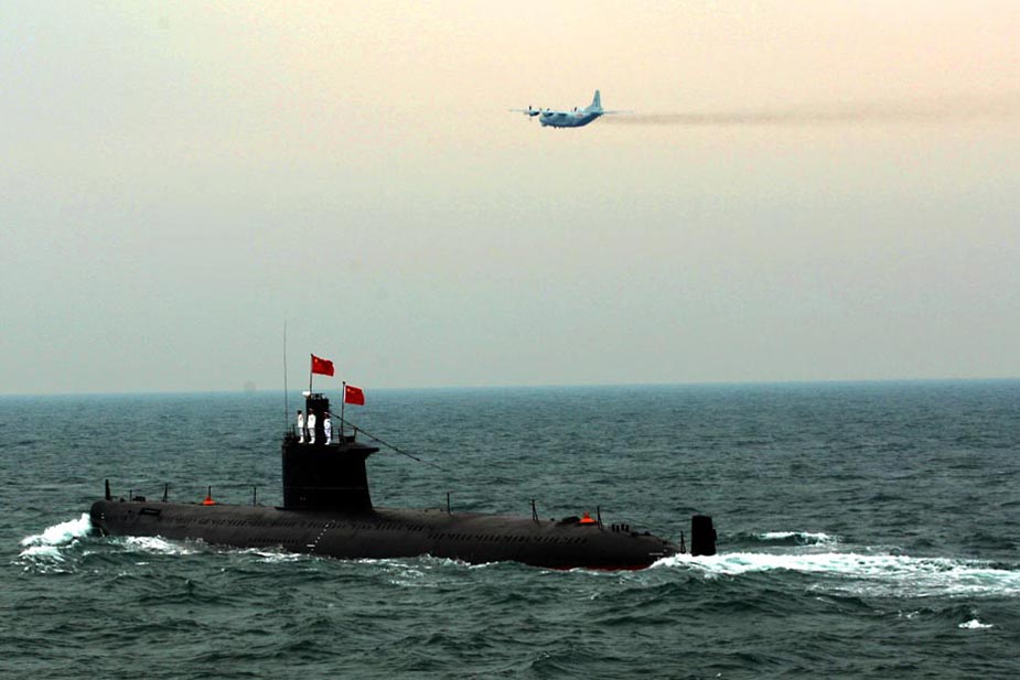4月23日下午,為紀(jì)念中國人民解放軍海軍成立60周年而舉行的海上閱兵在青島附近黃海海域舉行。長(zhǎng)征6號(hào)、長(zhǎng)征3號(hào)核動(dòng)力潛艇和長(zhǎng)城218號(hào)、長(zhǎng)城177號(hào)常規(guī)動(dòng)力潛艇依次接受檢閱。 中新社發(fā) 宋吉河 攝