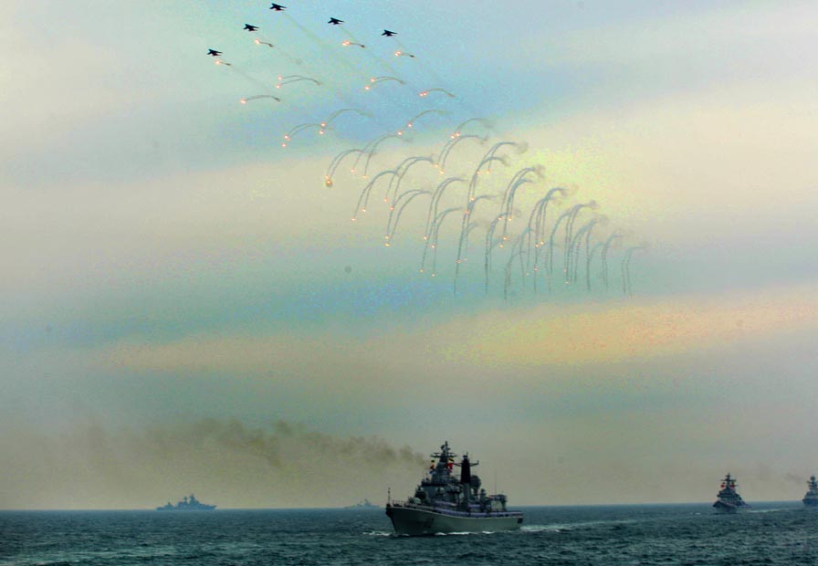 中國(guó)歷史上的首次多國(guó)海軍檢閱活動(dòng)四月二十三日下午在青島附近黃海海域舉行。中國(guó)國(guó)家主席、中央軍委主席胡錦濤乘閱兵艦“石家莊”號(hào)導(dǎo)彈驅(qū)逐艦,檢閱中國(guó)海軍的潛艇、水面艦艇、海軍航空兵和海軍陸戰(zhàn)隊(duì)等作戰(zhàn)兵種,并檢閱了來(lái)訪的十四個(gè)國(guó)家的二十一艘艦艇。 中新社發(fā) 宋吉河 攝