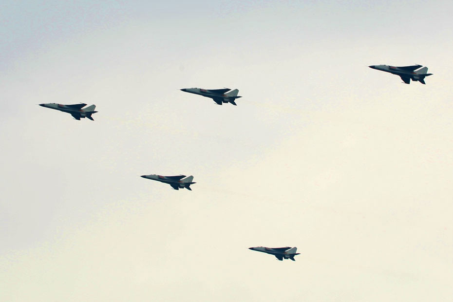 4月23日下午,為紀(jì)念中國人民解放軍海軍成立60周年而舉行的海上閱兵在青島附近黃海海域舉行。海上檢閱式分兩個階段,第一階段為海上分列式,檢閱中國海軍的艦艇和飛機(jī);第二階段為海上閱兵式,檢閱來自14個國家的21艘艦艇。圖為海軍航空兵震撼登場。中新社發(fā) 宋吉河 攝