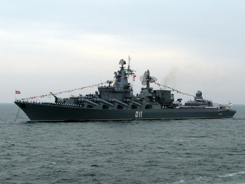 4月23日下午,為紀(jì)念中國人民解放軍海軍成立60周年而舉行的海上閱兵在青島附近黃海海域舉行。圖為舷號011俄羅斯“瓦良格”號導(dǎo)彈巡洋艦。 中新社發(fā) 琥珀旺旺 攝