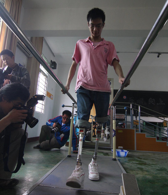 5月8日,“夾縫男孩”鄭海洋在四川省北川中學(xué)康復(fù)站進(jìn)行康復(fù)訓(xùn)練!皧A縫男孩”——北川中學(xué)高一學(xué)生鄭海洋在地震農(nóng)歷一周年5月2日重返校園,重新走入同學(xué)中間,開(kāi)始新的生活。 在去年汶川大地震中,北川中學(xué)兩幢教學(xué)樓倒塌,正在高一·二班上課的鄭海洋與同桌廖波被同埋于水泥板下,22個(gè)小時(shí)后,鄭海洋獲救,付出的代價(jià)是他年輕健壯的雙腿。因與同桌廖波同埋于水泥板夾縫之中,被外界稱(chēng)為“夾縫男孩”。將滿十八歲的鄭海洋,陽(yáng)光、帥氣?措娨、看書(shū)、上網(wǎng)是他的板房生活常態(tài),他穿戴假肢練習(xí)行走進(jìn)行康復(fù)訓(xùn)練,每次練習(xí)都要出一身大汗,F(xiàn)在的他已經(jīng)可以站立圍著板房區(qū)走一圈了。停學(xué)近一年的海洋進(jìn)入了新的高一·一班。母親跟他住在一間宿舍照顧他。新老師、新同學(xué)們也樂(lè)于關(guān)心他,為方便進(jìn)出專(zhuān)門(mén)安排他坐最后一排,下課時(shí),同學(xué)們會(huì)推著他到外面轉(zhuǎn)轉(zhuǎn)。學(xué)校給予鄭海洋每月三百元的生活補(bǔ)助,并在宿舍安排和生活上盡可能給予照顧。海洋穿上假肢可以行走,目前的臨時(shí)校區(qū)處在山坡地,上下坡假肢用不上力,只能坐輪椅。他希望即將開(kāi)工的新北川中學(xué)能夠?yàn)闅埣矊W(xué)生設(shè)立更便利的無(wú)障礙通道。中新社發(fā) 郭國(guó)權(quán) 攝