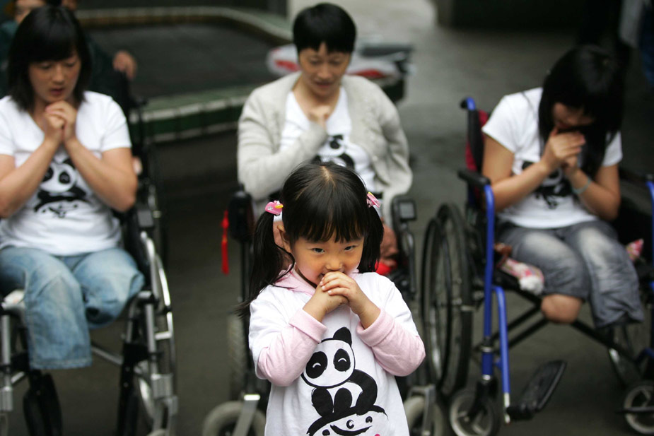 5月7日,小朋友王詩琪(前)及母親楊蘭(后左)還有幾位肢殘患者一起用手語演唱“感恩的心”。這對母女是汶川人,在大地震中女孩的父親不幸遇難,母親失去的雙腿,在康復(fù)中心楊蘭得到了全面的治療。四川大地震一周年之際,共計幾十家境內(nèi)外媒體的記者走進(jìn)位于四川省人民醫(yī)院內(nèi)的地震傷員康復(fù)中心。該中心去年六月二十三日成立后到今年四月三十日新收治地震傷員二百三十四人。中新社發(fā) 富田 攝