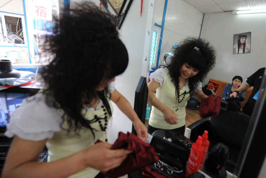 映秀鎮(zhèn)21歲的受災(zāi)姑娘小云,租借板房開設(shè)“80后”美容美發(fā)室,在此地小有名氣。中新社發(fā) 賈國(guó)榮 攝