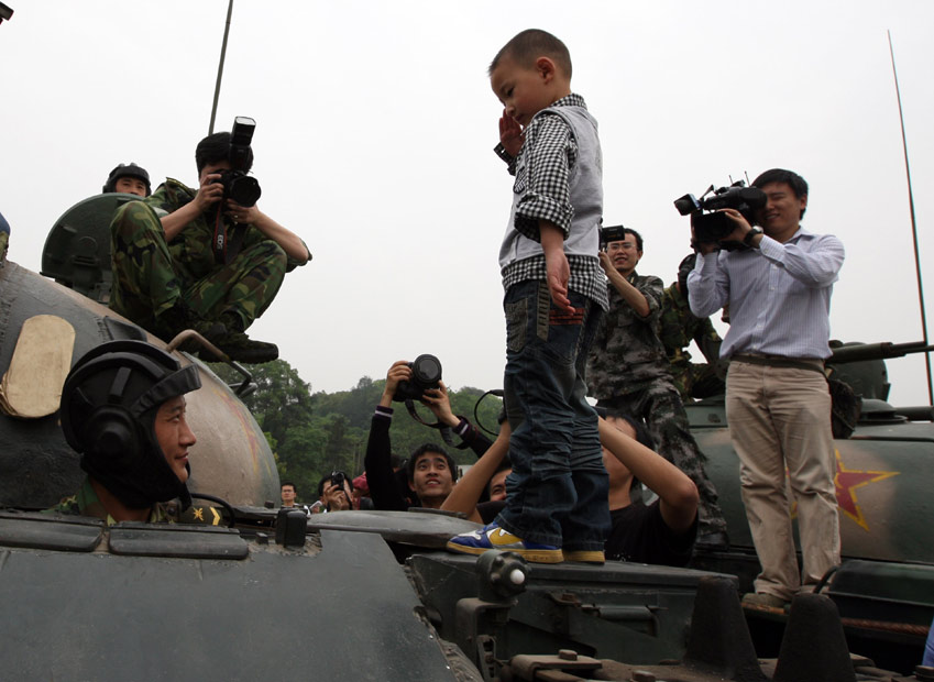 4月25日,汶川大地震幸存者“敬禮娃娃”郎崢一家來(lái)到成都軍區(qū)駐渝某部營(yíng)區(qū),感謝該部戰(zhàn)士在廢墟中救出郎崢的性命。2008年5月13日晨,3歲的郎崢被解放軍官兵從廢墟里救出后,躺在一塊小木板做的臨時(shí)擔(dān)架上,用他稚嫩的右手向8位抬著他的解放軍叔叔敬了個(gè)少先隊(duì)禮,他的舉動(dòng)引起社會(huì)各界高度關(guān)注,被媒體稱為“敬禮娃娃”。圖為郎崢在營(yíng)區(qū)內(nèi)見(jiàn)到夢(mèng)寐以求的坦克,爬到坦克車(chē)上用一個(gè)軍禮向解放軍叔叔表示感謝。中新社發(fā) 郭晉嘉 攝