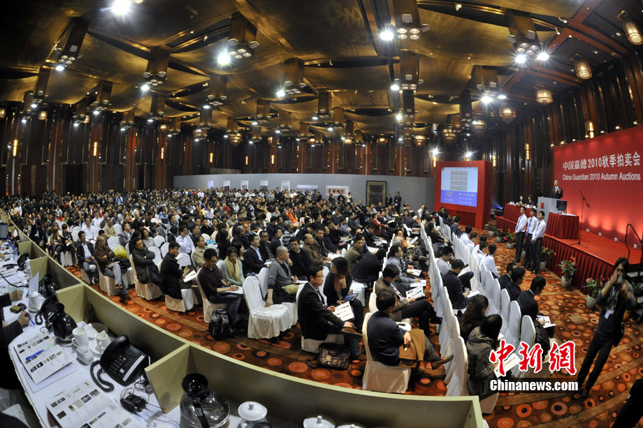 11月20日晚,在中國嘉德2010秋季拍賣會“秋光萬華——清代宮廷藝術集粹”專場中,王羲之草書《平安帖》以人民幣三億零八百萬成交。圖為該專場拍賣現(xiàn)場。中新社 寇勤 攝