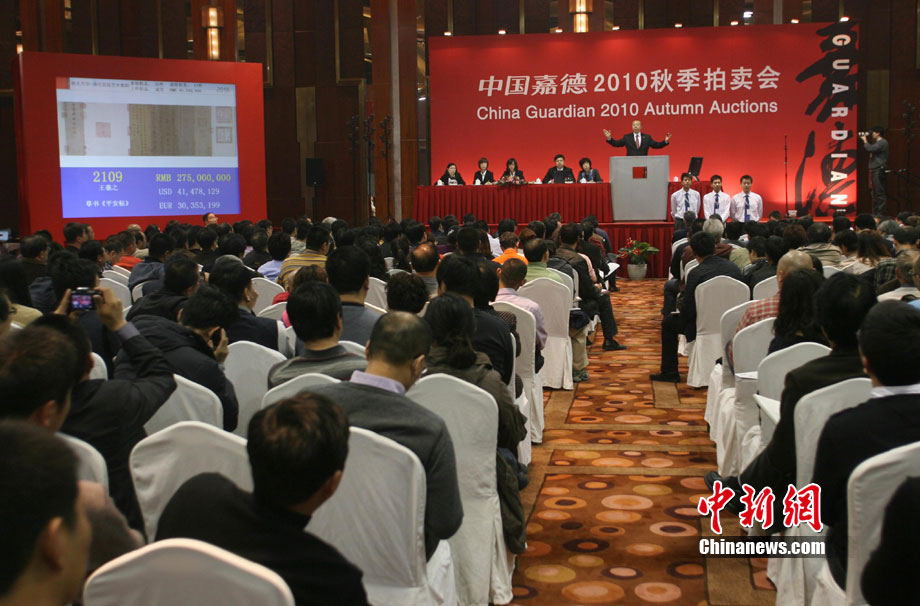 11月20日晚,在中國嘉德2010秋季拍賣會“秋光萬華——清代宮廷藝術(shù)集粹”專場中,王羲之草書《平安帖》以人民幣三億零八百萬成交。中新社 蘇丹 攝