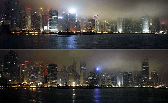 中國香港。3月28日,熄燈前后的香港維多利亞港港島一側(cè)。