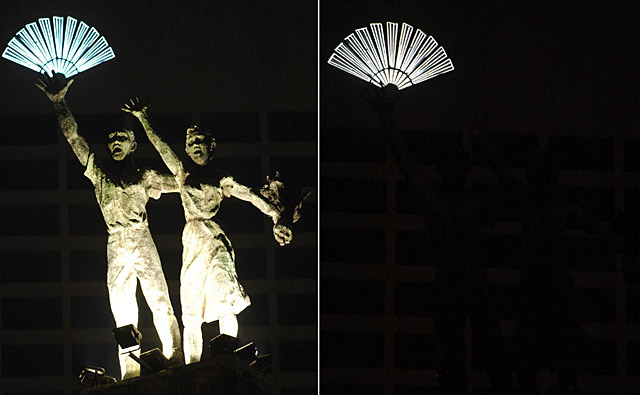 印度尼西亞雅加達:3月28日,印度尼西亞首都雅加達的印尼環(huán)形廣場雕塑在參與“地球一小時”熄燈行動前(左)和熄燈后(右)的對比情況。
