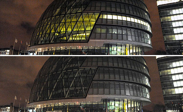 英國倫敦:3月28日,英國倫敦市政廳熄燈時和重新亮燈后的對比情況。