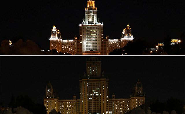 俄羅斯莫斯科:3月28日俄羅斯莫斯科大學(xué)熄燈前(上)和熄燈后(下)的對比情況。