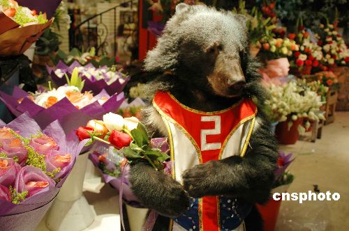 2月11日中午,在浙江省溫嶺市萬(wàn)壽路的含羞草花店里,來(lái)了一位特殊的“客人”——溫嶺動(dòng)物園的黑熊,它是為2月14日的“情人節(jié)”“準(zhǔn)備”鮮花的。動(dòng)物園的飼養(yǎng)說(shuō),每年“情人節(jié)”前,都要陪這位“黑熊大哥”上街“選購(gòu)”鮮花。中新社發(fā) 江勇兵 攝