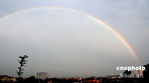 6月15日19時(shí),漢中東南部天空出現(xiàn)20多年來(lái)少見(jiàn)的彩虹。 中新社發(fā) 周軍 攝
