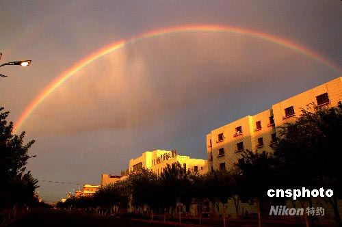 7月15日晚9時10分左右,新疆吐魯番市上空出現(xiàn)一道完整美麗彩虹,持續(xù)近10分鐘,街頭行人紛紛駐足觀看。中新社發(fā) 劉健 攝