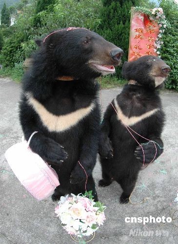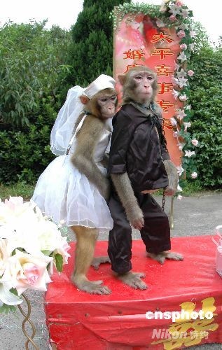 9月4日上午,浙江省溫嶺動(dòng)物園為發(fā)育成熟的兩只猴子和兩只狗熊,策劃兩場(chǎng)特殊的“婚禮”。所謂“悟空”夫妻,“新郎”名叫悟空,“新娘”名叫小丫;“狗熊”夫妻,“新郎”名叫大黑,“新娘”名叫二蘭。中新社發(fā) 江勇兵 攝