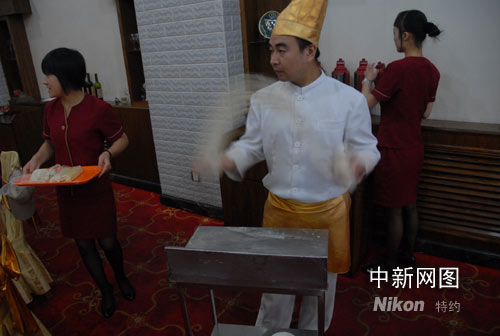 蘭州人吃牛肉面吃出了名堂,吃上了癮。如今,蘭州市的每條街巷,無論大小,至少都有一兩家牛肉面館。黃河岸邊的古城蘭州,彌漫在大街小巷的,永遠有那股牛肉面的清香!疤m州人三天不來個‘牛大碗’就心火難捺”。聽起來有點夸張,不過,牛肉面確實已成為蘭州人生活中不可或缺的一部分。別以為煮面條加上牛肉片就是牛肉面了。蘭州牛肉面的精致與吃法考究令人瞠目。觀看拉面好像是欣賞雜技表演,拉面師傅操起面節(jié),一搓一拉,連抻數(shù)次,即變戲法似地拉繞出一碗細長的面條拉到最后時的“一拉一閃”又仿佛是舞蹈演員在揮舞著彩帶。王紅綱 攝