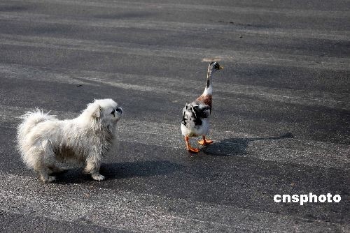 俗話說:狗攆鴨子呱呱叫,然而,家住河南洛陽濱河新村的徐先生家養(yǎng)的小狗“毛毛”和鴨子“鴨鴨”卻是一對莫逆好友,它們同吃、同住、同娛樂,整天形影不離。據(jù)徐先生說:“狗鴨已交往了3年,鴨鴨是孩子她嬸送給孩子飼養(yǎng)的寵物,2005年10月,抱回來的時候還是一只毛茸茸的小雛鴨,小家伙一見毛毛就嚇得渾身發(fā)抖,到處亂鉆?墒遣恢朗裁磿r候,它卻與毛毛交上了朋友,還睡到了毛毛的狗窩里,兩個小家伙相依相偎的很和諧。直到2006年6月鴨鴨快一歲了它們才不在一個窩里住,但是鴨鴨和毛毛還是整天形影不離。中新社發(fā) 曾憲平 攝