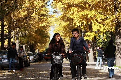 在北京林業(yè)大學(xué)校園里,金黃色的銀杏樹吸引了眾多游人。中新社發(fā) 鄭雄增 攝