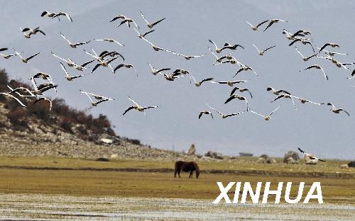 11月5日,斑頭雁從納帕海周邊的上空飛過(guò)。近年來(lái),云南香格里拉縣藏語(yǔ)意為“森林旁邊的湖”的納帕海,成為黑頸鶴、斑頭雁、黃鴨等鳥(niǎo)類的越冬樂(lè)園,每年有數(shù)萬(wàn)只候鳥(niǎo)來(lái)此越冬。新華社記者鄒崢攝