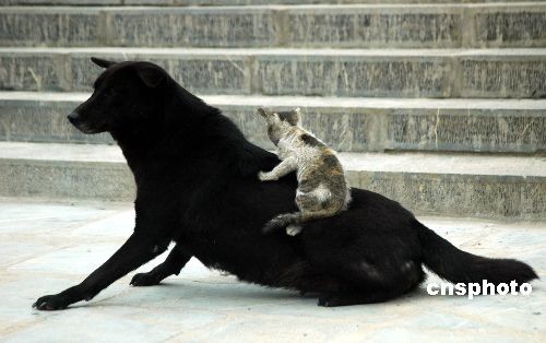 11月16日,一只小貓趴在黑狗的背上。安徽巢湖市居巢區(qū)散兵鎮(zhèn)凌山村一農(nóng)戶家里養(yǎng)著一只花貓和兩條狗。據(jù)主人介紹,小花貓因還在喝奶的時候,貓媽媽就病死了,營養(yǎng)不良,所以已經(jīng)一歲多的小花貓長得很瘦弱,兩條狗卻像貓媽媽那樣愛護(hù)著它,小花貓有時很頑皮,騎在狗背上玩耍,構(gòu)成一幅貓狗一家親令人感動的圖畫。中新社發(fā) 徐振華 攝
