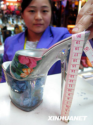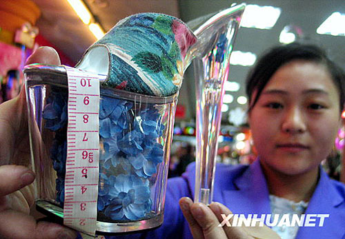 12月15日,在濟(jì)南一商場,工作人員展示“超級高跟鞋”。這款“超級高跟鞋”造型獨(dú)特,款式夸張,鞋底厚10厘米,鞋跟高20厘米,吸引了許多顧客的眼球。新華社發(fā)(趙曉明 攝)