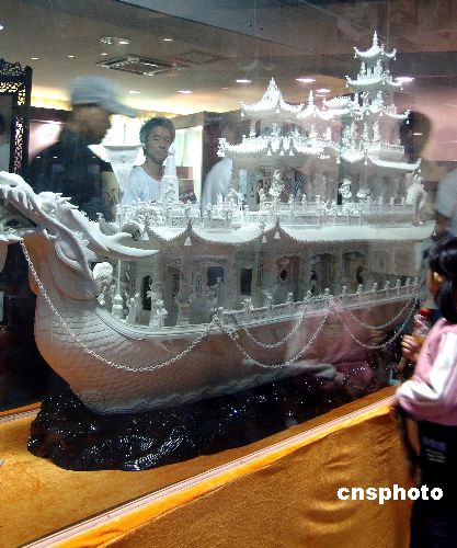 10月20日,2007景德鎮(zhèn)國際陶瓷博覽會上展出的《奧運(yùn)盛會》巨型瓷雕龍船。該船由江西景德鎮(zhèn)工藝美術(shù)師劉松林用6年多時間潛心創(chuàng)作并成功燒制的。船長2.08米、高1.16米、寬0.5米,五層樓閣的龍船上有42個運(yùn)動項目的88位運(yùn)動員造型,欄桿上刻有奧運(yùn)五環(huán)和國旗。中新社發(fā) 石衛(wèi)明 攝