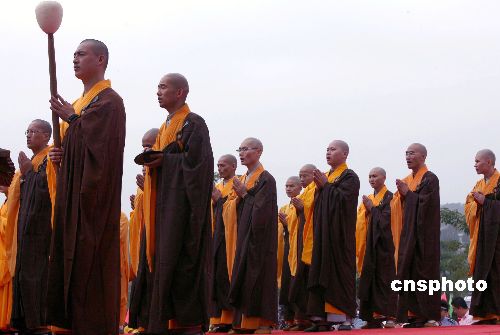 10月30日,中國(莆田)南北少林武術(shù)公演盛會在莆田南少林寺隆重舉行,圖為福建佛學(xué)院學(xué)生梵唱團(tuán)108位法師表演《和平梵頌》。中新社發(fā) 張勤 攝