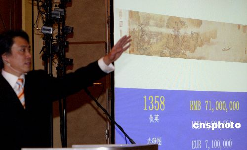 11月6日晚,中國嘉德2007秋季拍賣會的國寶級拍品明代仇英《赤壁圖》,最終以7952萬元人民幣(含傭金)的天價成交,創(chuàng)下中國繪畫作品(包括所有中國書畫和油畫作品)拍賣的世界紀(jì)錄。據(jù)悉,該作品由中國內(nèi)地買家競得。此幅作品受到藏家的極大關(guān)注,拍賣現(xiàn)場氣氛非常熱烈,拍賣師報出4000萬元人民幣的起價后,隨即就有買家舉牌應(yīng)價。此后,現(xiàn)場買家與委托席叫價此起彼伏,競價不斷飆升,爭奪趨于白熱化,最終以7100萬元人民幣的價格落槌。中新社發(fā) 張煒 攝