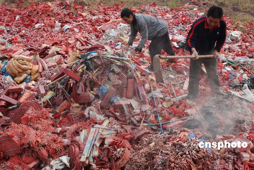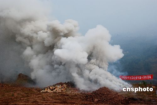 11月8日,重慶市云陽縣集中銷毀了620萬響非法生產(chǎn)和經(jīng)營的煙花爆竹,消除了安全隱患。這些煙花爆竹是該縣在全國消防安全日前夕,對全縣43個鄉(xiāng)鎮(zhèn)進(jìn)行排查時收繳的。中新社發(fā) 劉小洋 攝