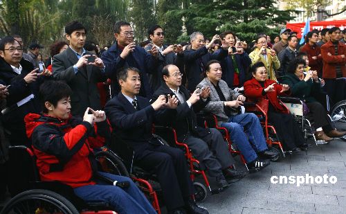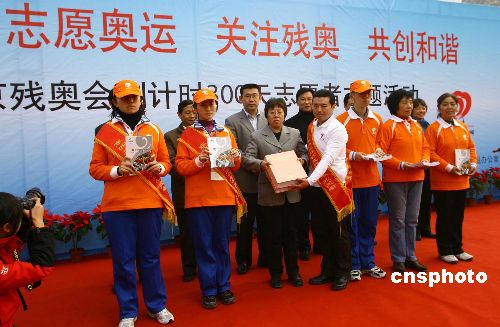 11月11日,主題為“微笑北京、志愿奧運、關(guān)注殘奧、共創(chuàng)和諧”的2008北京殘奧會倒計時300天志愿者主題活動,在北京東四奧林匹克社區(qū)公園舉行,《北京殘奧會志愿者培訓(xùn)教材》中文版和盲文版首發(fā),同時為第二批奧運會、殘奧會志愿者培訓(xùn)基地授牌。中新社發(fā) 杜洋 攝