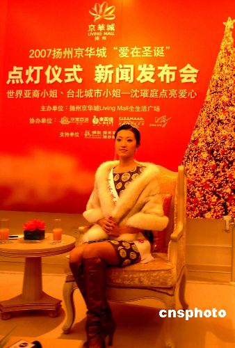 11月30日,揚(yáng)州舉辦“愛在圣誕”點燈儀式及中國麥田計劃獻(xiàn)愛心新聞發(fā)布會。世界亞裔小姐、臺北城市小姐沈璀庭出席,并將于12月1日晚在揚(yáng)州京華城廣場為21米高的巨型圣誕樹啟動“愛在圣誕”點燈儀式,并與“中國麥田計劃”愛心慈善團(tuán)體攜手獻(xiàn)愛心。“中國麥田計劃”于2005年成立,是一個為貧困地區(qū)兒童建立圖書室、捐贈衣物及創(chuàng)造讀書機(jī)會的民間志愿組織。中新社發(fā) 崔佳明 攝
