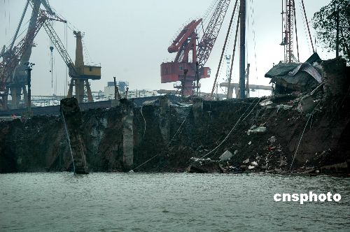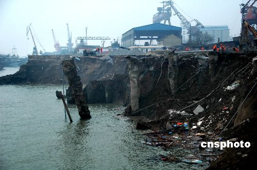 12月2日上午拍攝的坍塌現(xiàn)場圖片。12月1日晚,安徽省蕪湖市江東船廠岸邊,長約90米7000多平方米的江堤突然坍塌,江東船廠10多間倉庫、一輛吊車及停在岸邊的一條躉船沉入水中。躉船上兩位值班的老人被一停留在岸邊的采砂船救起,事故造成近千萬元損失。目前,坍方現(xiàn)場得到控制。中新社發(fā) 老春 攝