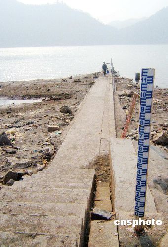 2007年12月7日,湖北宜昌江段裸露的江灘和水位標(biāo)尺。目前長(zhǎng)江已進(jìn)入一年一度的枯水期,近期長(zhǎng)江中游水位持續(xù)退落,比多年同期平均水位低近1.5米,根據(jù)當(dāng)前枯水形勢(shì)及水位水情特征,長(zhǎng)江航務(wù)管理局決定,長(zhǎng)江中游實(shí)施二級(jí)橙色預(yù)警。對(duì)通過中游的船舶吃水深度進(jìn)行規(guī)定,普通貨船實(shí)際吃水控制在2.4米及以下,危險(xiǎn)品船舶實(shí)際吃水控制在2.3米及以下,下行船舶超過吃水限制的一律在宜昌港減載。中新社發(fā) 任衛(wèi)紅 攝