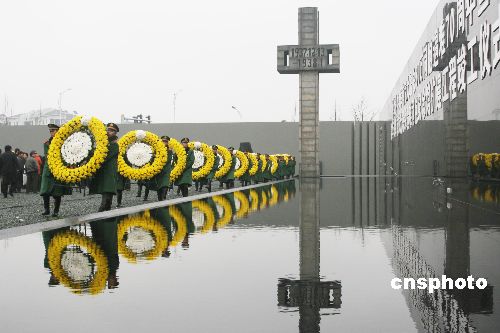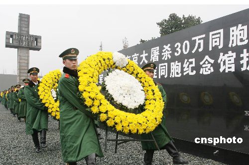 2007年12月12日,在侵華日軍南京大屠殺遇難同胞紀(jì)念館集會(huì)廣場上,武警南京市支隊(duì)國旗護(hù)衛(wèi)隊(duì)隊(duì)員正在進(jìn)行向南京大屠殺遇難同胞敬獻(xiàn)花圈儀式排練。12月13日是南京大屠殺紀(jì)念日,南京市將在此舉行悼念侵華日軍南京大屠殺30萬同胞遇難70周年紀(jì)念儀式暨侵華日軍南京大屠殺遇難同胞紀(jì)念館擴(kuò)建工程竣工儀式。中新社發(fā) 韓華 攝