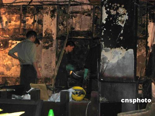 廣東東莞市樟木頭鎮(zhèn)怡安街名典西餐廳十二月十二日晚發(fā)生火災(zāi),現(xiàn)場死傷十九人,其中死亡十人,重傷一人,輕傷八人,至深夜重傷者也不治身亡。樟木頭素有小香港之稱,境外人士眾多,火災(zāi)發(fā)生后坊間曾傳聞死者中有外國人,十三日從樟木頭鎮(zhèn)政府得到證實,火災(zāi)死傷者皆為中國內(nèi)地人士,并無境外人士。圖為火災(zāi)撲滅后的名典西餐廳內(nèi)一片狼藉,消防隊員在現(xiàn)場進(jìn)行勘查。中新社發(fā) 李映民 攝