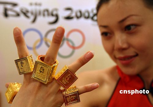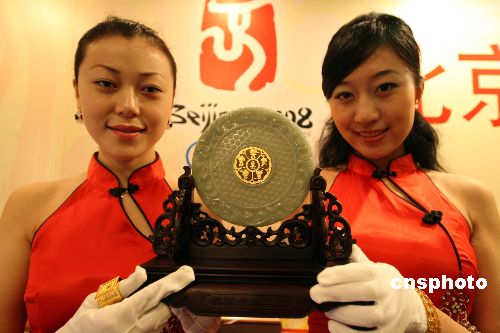 十二月十九日,由北京繁榮文化發(fā)展有限公司推出的五十余款奧運紀念章與消費者見面,此舉使得北京奧運特許商品這一大家族又增添了“新成員”。這些限量發(fā)行的“新成員”,多為大眾化商品,價格在一百元人民幣的就有二十多種,內(nèi)容涉及不同題材,如體育、科技、文化、城市等,其中最吸引人的還是設(shè)計制作獨特的奧運金章玉璧等高端商品。中新社發(fā) 任海霞 攝