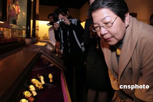 十二月二十三日,臺灣著名女詩人、散文家、畫家席慕容來到福建泉州中國閩臺緣博物館參觀,當(dāng)她看到兩岸傳統(tǒng)習(xí)俗和傳統(tǒng)技藝展示時大為感動,像回到了童年時代。圖為席慕容在木偶頭像前駐足了許久。中新社發(fā) 傅丹丹 攝