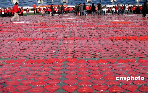 十二月二十九日,一個(gè)名為“共享健康·愛心接力”大型公益活動(dòng)在北京奧體中心體育場和廣州奧體中心體育場同時(shí)展開。一千位來自中國各地的老人作為“愛心大使”,把載滿愛心故事的十萬顆小紅“心”貼成兩顆巨大的“愛心”,以沖擊吉尼斯世界紀(jì)錄。中新社發(fā) 黎仲顏 攝