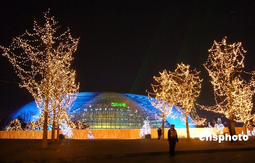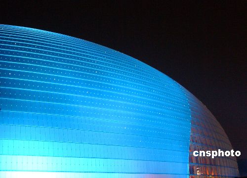 12月30日晚,北京國(guó)家大劇院四周燈光閃爍,夜色璀璨,蔚藍(lán)色的國(guó)家大劇院在夜幕中顯得美麗迷人。當(dāng)晚,有關(guān)人員在調(diào)試燈光,以迎接12月31日在這里舉行的2008年新年音樂(lè)會(huì)。中新社發(fā) 玉龍 攝