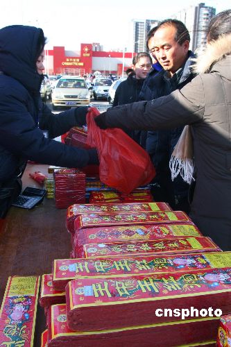 12月30日,北京市開始大規(guī)模向五環(huán)外沃爾瑪?shù)却笮统辛闶劬W(wǎng)點配送花炮,五環(huán)外的一些臨時網(wǎng)點也掛上新頒發(fā)的許可證準(zhǔn)備開業(yè)。元旦節(jié)前,市民可到五環(huán)外的這些零售網(wǎng)點購買花炮。中新社發(fā) 富田 攝