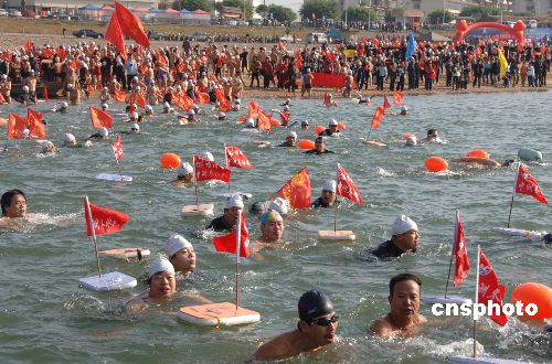 1月1日是全國(guó)冬泳日,福州市冬泳協(xié)會(huì)組織的千余名冬泳健兒,從福州閩江公園西河園入水,往返橫渡閩江,以此迎接新年的到來(lái)。中新社發(fā) 鄭祚聲 攝