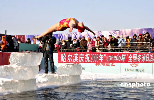 2008年元旦,哈爾濱江上運動中心500多國內(nèi)外游客在觀看冬泳表演。當天200多名哈爾濱冬泳健兒在松花江職工冬泳場,以冬泳表演的方式歡度元旦。中新社發(fā) 姚庭山 攝